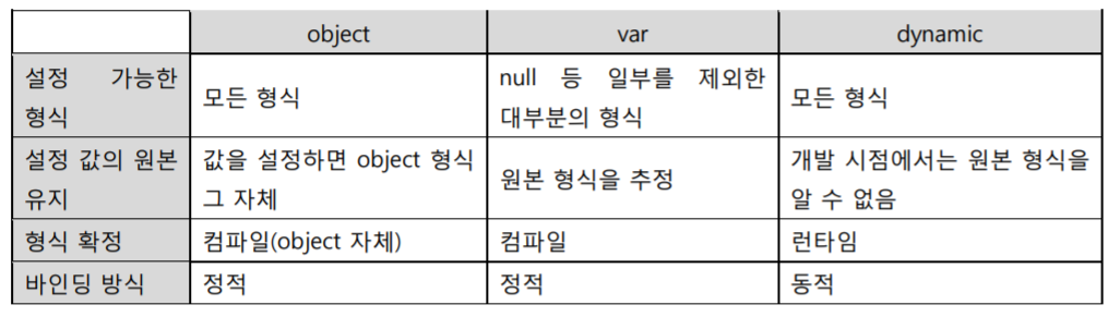 - var 형식은 모든 형식을 설정할 수 있지만 컴파일 시점에 형식이 확정되므로 성능상의 이슈는 없다.