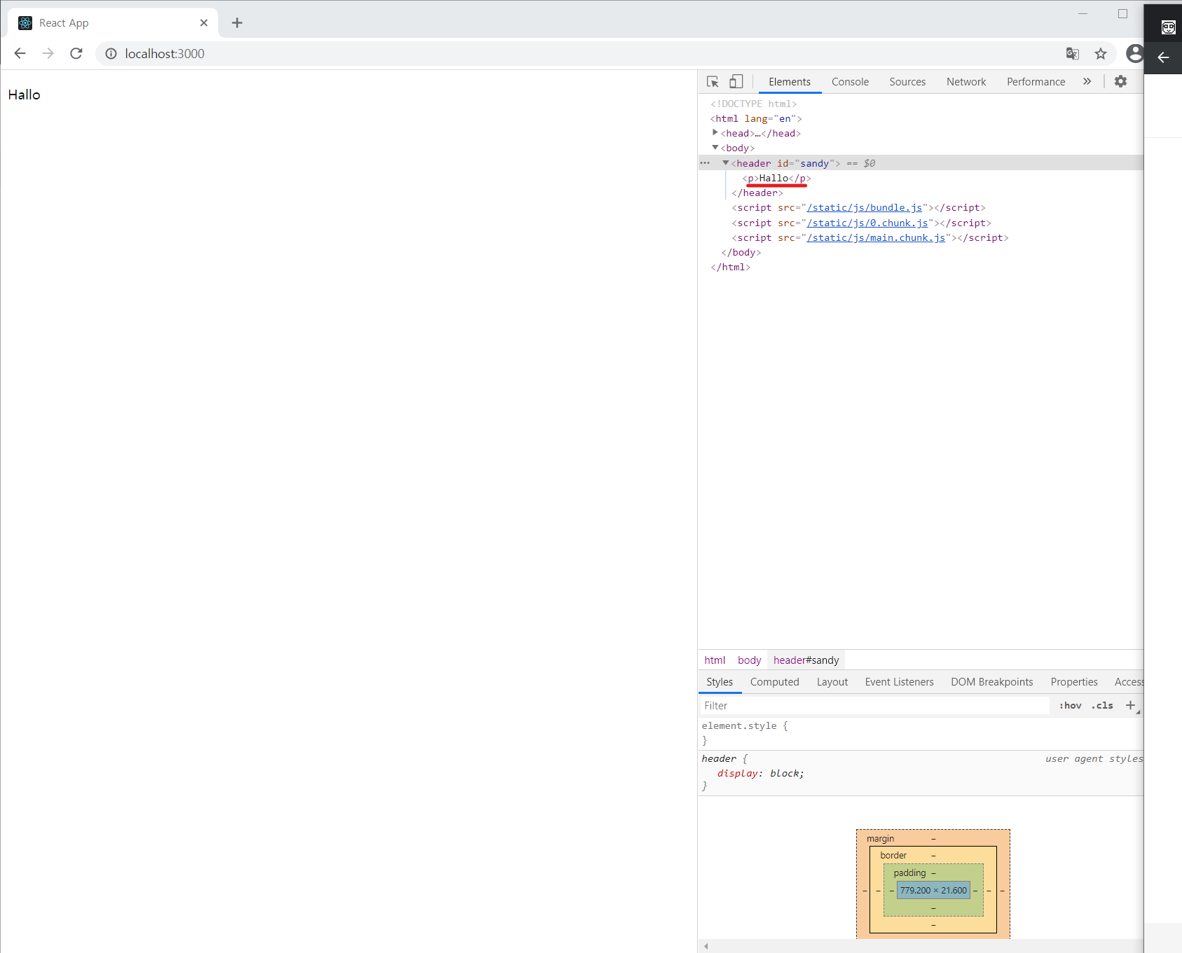 - 위 코드 2개를 실행 후 결과를 보면 <p>Hallo</p> 가 <header> 밑에 추가 되어 있다.