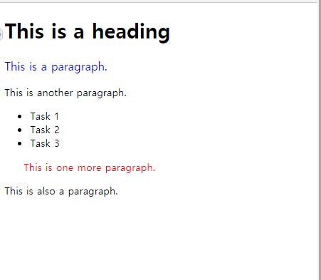 - 아래의 예에서는 <p>은 문서 트리에서 위치에 관계없이 문서의 모든 요소에 파란색으로 적용된다.