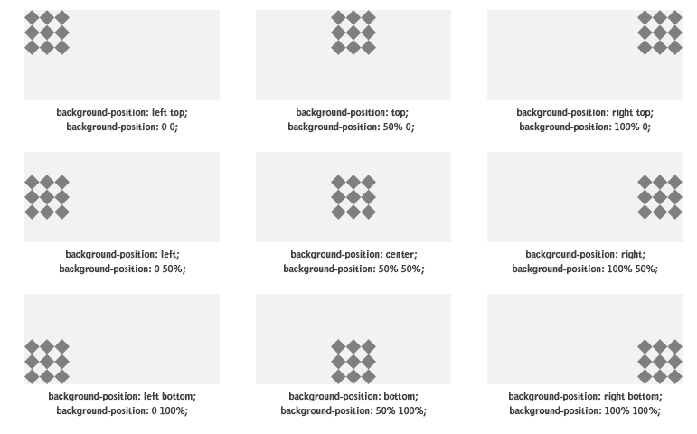 - background-position 속성에 대해 두 개의 값이 지정된 경우 첫 번째 값은 가로 위치, 두 번째 값은 세로 위치를 나타낸다. 첫 번째 값만 지정한다면 두 번째 값은 중앙으로 간주한다.