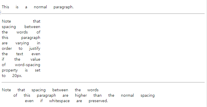 <p class="two">Note that spacing between the words of this paragraph are varying in order to justify the text even if the value of word-spacing property is set to 20px.</p>